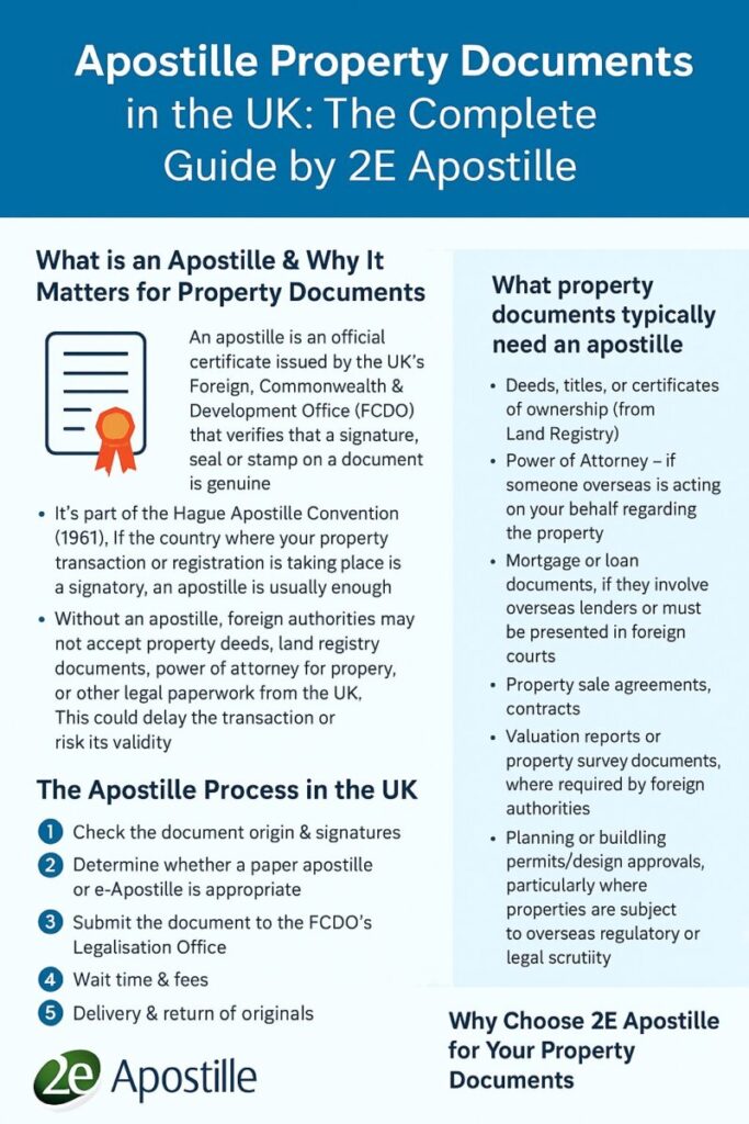 When buying property overseas or engaging in any international real estate transaction, having properly legalized documents is essential. For property documents issued in the UK to be recognised abroad, they often need an apostille. At 2E Apostille, we specialise in fast, secure apostille services throughout the UK, including for all property‐related documents. This guide will walk you through everything you need to know.
