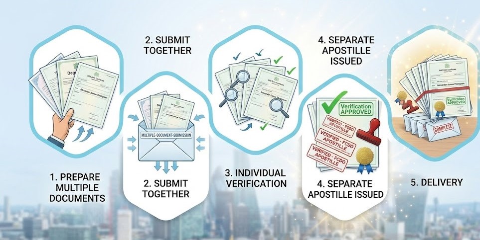 While it may seem convenient, one apostille cannot cover multiple documents in the UK. Each document must be individually verified and certified to ensure its authenticity.