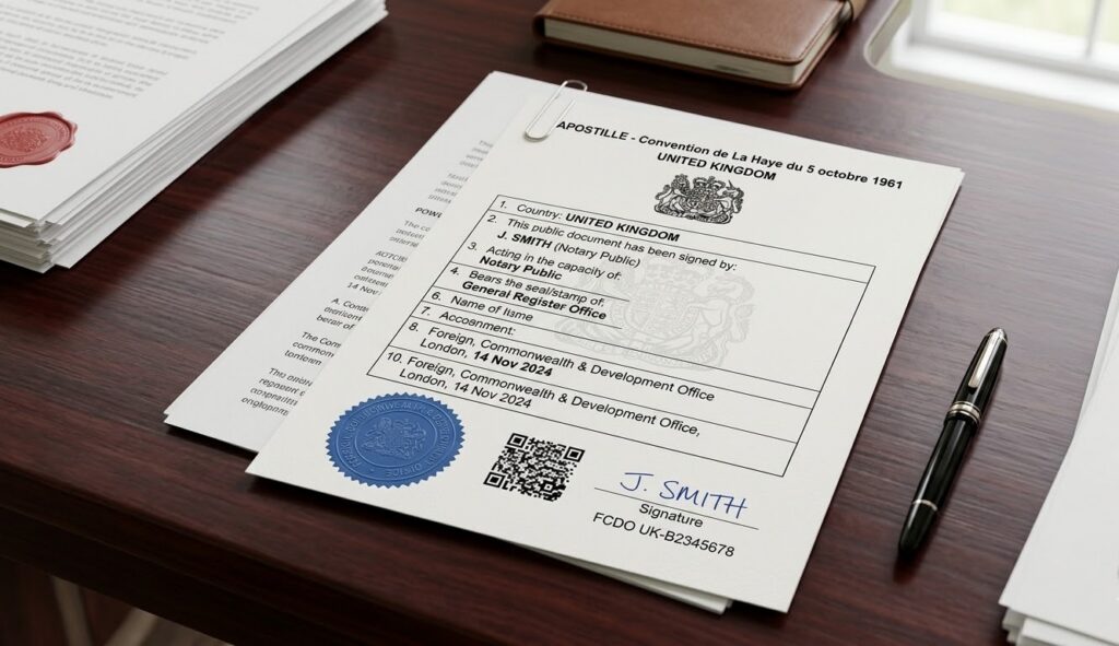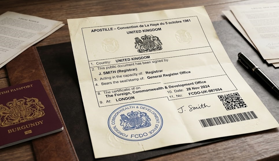 An apostille is an official certification that verifies the authenticity of a document for international use. Under the Hague Apostille Convention, documents from one member country (like the UK) can be recognised in another member country (like France).
