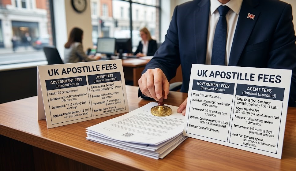 How much does an apostille cost in the UK (government vs agent fees)?