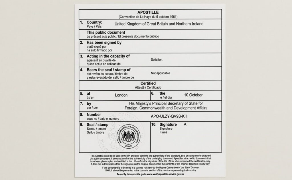 An apostille is an official certificate issued by the Foreign, Commonwealth & Development Office (FCDO). It verifies that a UK document is genuine and can be recognised in another country.